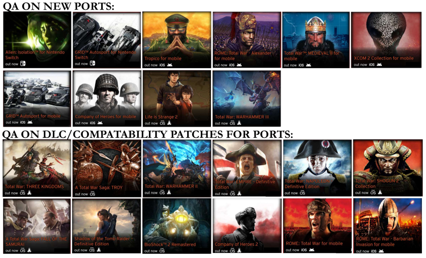 Prior to working Production, I spent one year in QA at Feral Interactive and worked on the following ports to Switch, iOS (iPhone and iPad), Android, Mac, Linux: